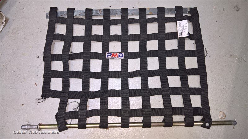 This is a used window net. It is a bit old so I wouldn't recommend using it for racing, though it would look cool hung up on the wall of your garage.