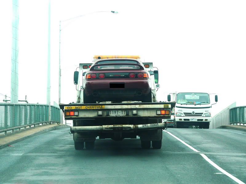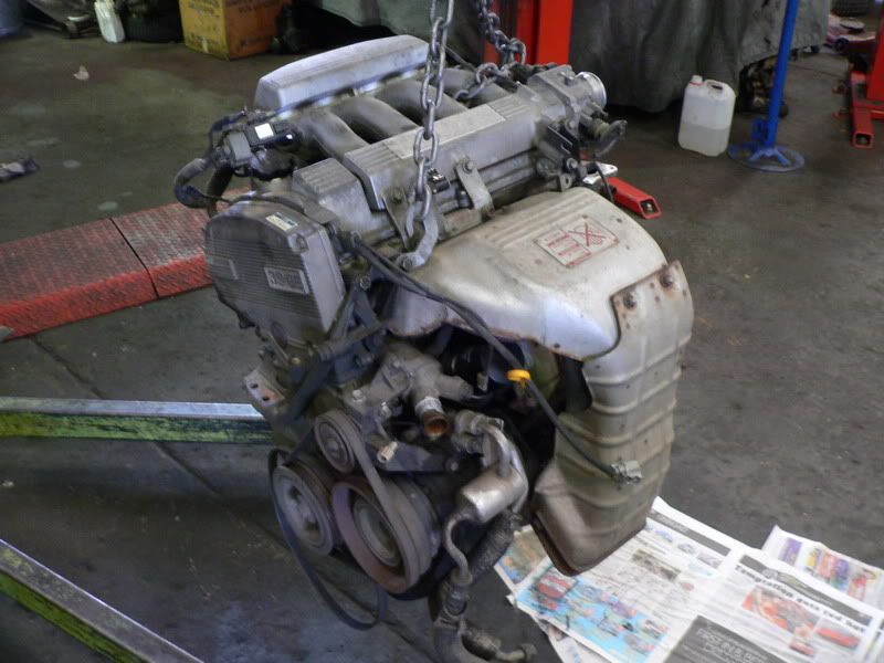 UPDATE:I decided to take the day off today and got the car towed to IDB. It turned out to be a very productive day with the below done: - I attached the tail light and power antenna plugs to the BEAMS body loom. - Original (Generation II) 3S-GE removed - Done by one of Ian's workers. - Trav and I unbolted the gearbox, clutch and flywheel from the engine. - Pushed the car to Anson Auto where the front compartment and engine bay will be painted. Pictures below: