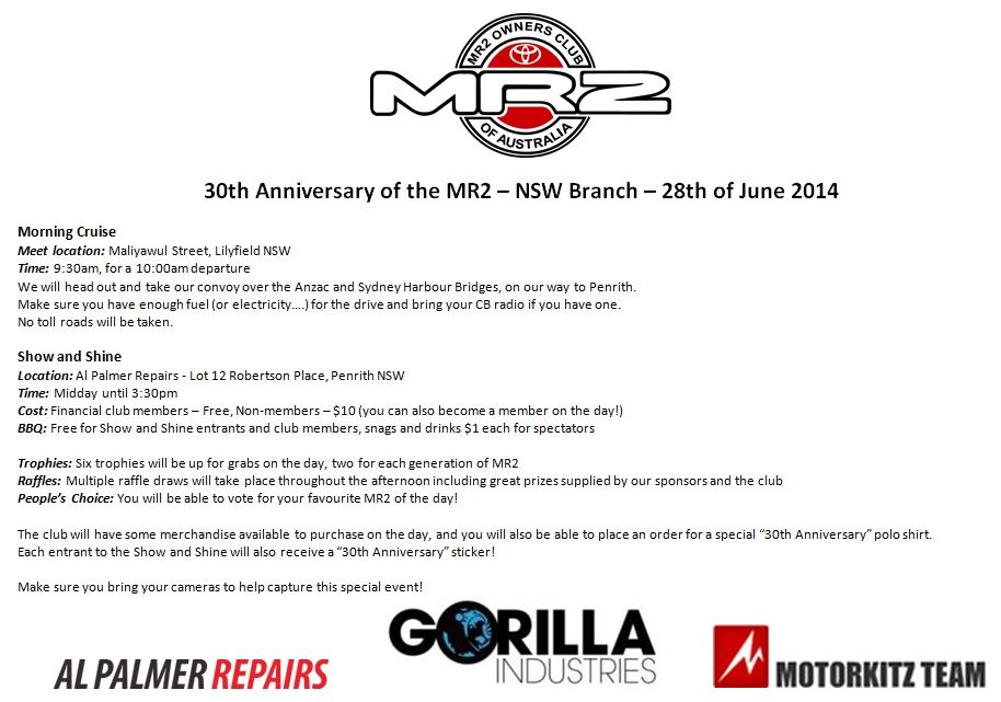 Re: MR2 Club NSW - Toyota MR2 30th Anniversary Event - 28th of June