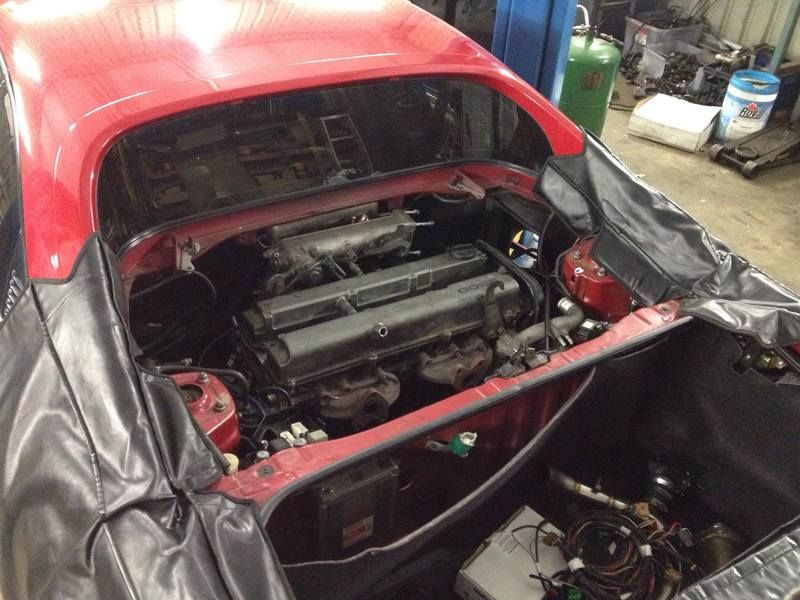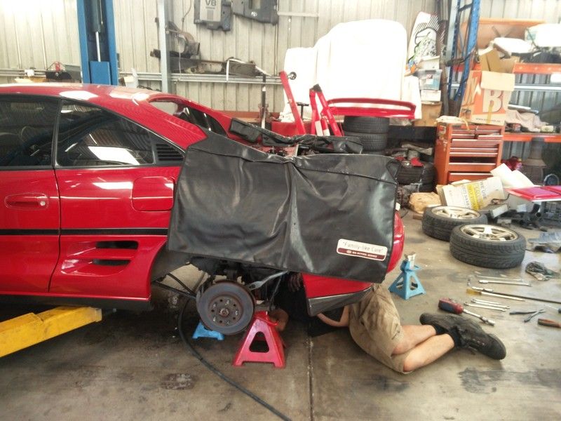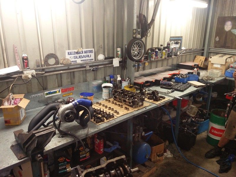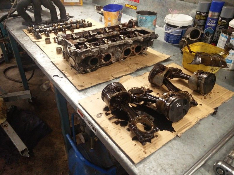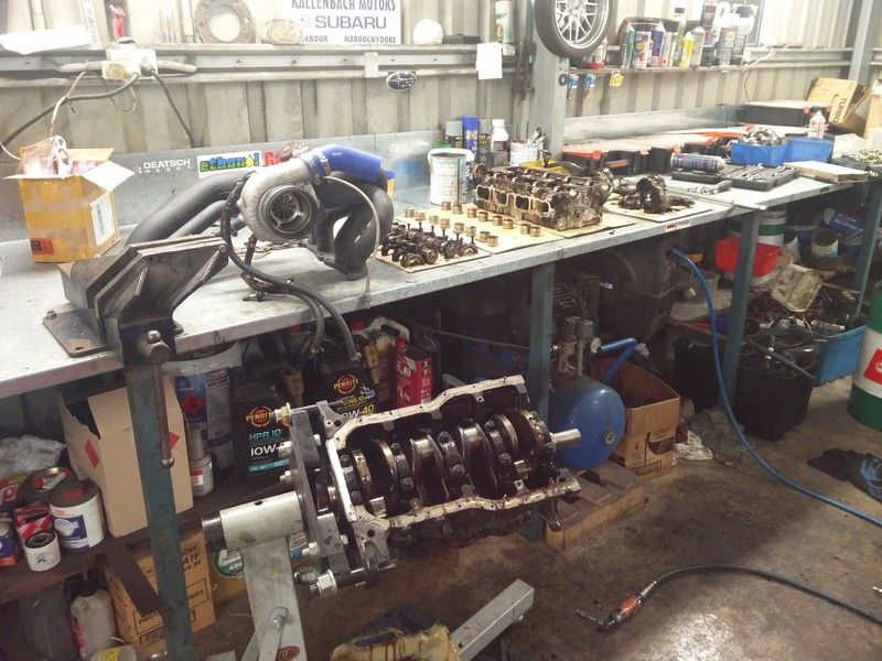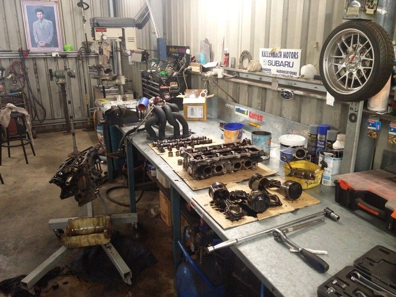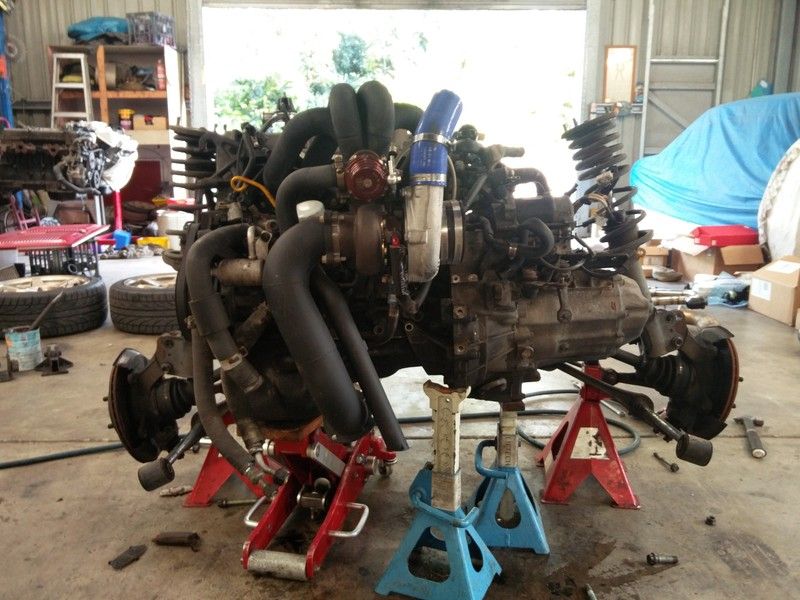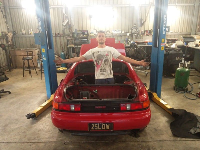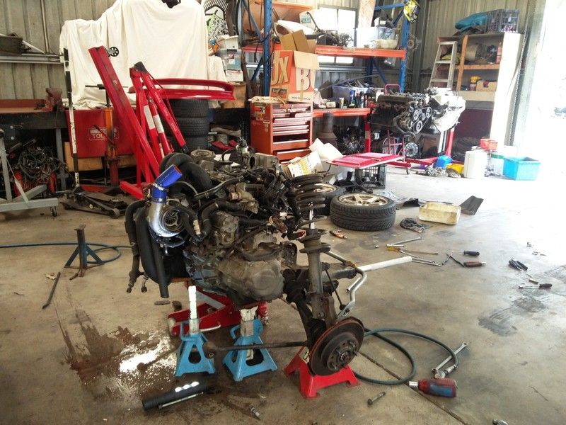 UPDATE TIME. nearly 3 years later and i started the build yesterday, dropped the motor/rear sub frame/ shocks in just over 2 hours. anyway ill let the pics do the talking. One problem is that when i bought most of my engine parts nearly 3 years ago i did not check everything, they sent me out RB26 main studs, which sucks, but if they wont replace them no biggie cause theRB26 cost nearly 3x more. Another is the cheap thin paper gaskets the "cometic" kit comes with. they look terrible, might have to buy some OEM ones for a few things. Had a look at my rear brakes because my rear left wheel was heating up when driving, the piston looked nasty, all clogged up with rusty old grease mess, pulled both rear calipers apart and gave them a clean/re grease The good old standing in engine bay pic motor looked ok a bit of carbon here and there, the water galleries were clogged up a bit, prob due to lack of service, (was holding out to do this build, turns out took a bit longer than planned) hehe Went to check the cams and found that i had 2 intake cams in the box, at first i was pissed but after someone told me that the BC cams are like that and doing my own research i cant find anything that says its not, if anyone who has installed BC cams before could let me know cheers. All this took a day, very impressed with my brother who is helping me out, anyone who watched MCM might reconise the garage. we also had a 1JZ there so we popped it in for some pics, TROLL the internet for a day, it went nuts on MR2OC. haha we tried to fit a 1UZ but couldn't get it in there. Next is waiting to sort out main stud issue then off to machine shop.
