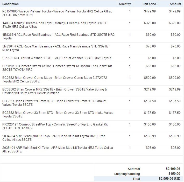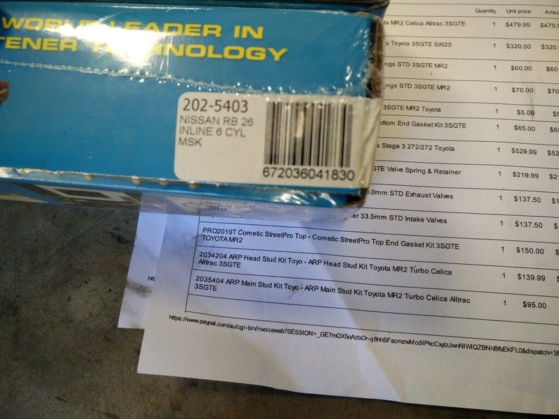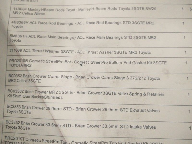 update: just purchased a few bits and pieces for an engine build which i am going to be doing myself along with my brother and a friend of his. list so far is: Wiseco Pistons Toyota - Wiseco Pistons Toyota MR2 3SGTE 86.5mm 9.0:1 Manley HBeam Rods Toyot - Manley H-Beam Rods Toyota 3SGTE SW20 MR2 ACL Race Rod Bearings - ACL Race Rod Bearings STD 3SGTE MR2 Toyota ACL Race Main Bearings - ACL Race Main Bearings STD 3SGTE MR2 Toyota ACL Thrust Washer 3SGTE - ACL Thrust Washer 3SGTE MR2 Toyota Cometic StreetPro Bottom End Gasket Kit 3SGTE TOYOTA MR2 Brian Crower Cams Stage 3 272/272 Toyota MR2 Celica 3SGTE Brian Crower 3SGTE Valve Spring & Retainer Kit Shim Over Bucket/Shimless Brian Crower 29.0mm STD - Brian Crower 29.0mm STD Exhaust Valves Toyota 3SGTE Brian Crower 33.5mm STD - Brian Crower 33.5mm STD Intake Valves Toyota 3SGTE Cometic StreetPro Top - Cometic StreetPro Top End Gasket Kit 3SGTE TOYOTA MR2 ARP Head Stud Kit Toyo - ARP Head Stud Kit Toyota MR2 Turbo Celica Alltrac 3SGTE ARP Main Stud Kit Toyo - ARP Main Stud Kit Toyota MR2 Turbo Celica Alltrac 3SGTE. i going to be getting a few more bits and pieces but this is what i have already paid for.