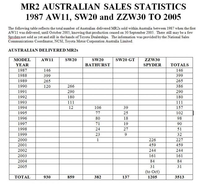 I hope this is readable. Sales figures supplied by Toyota in October 2005. These figures represent only Australian delivered MR2s sold by Toyota.
