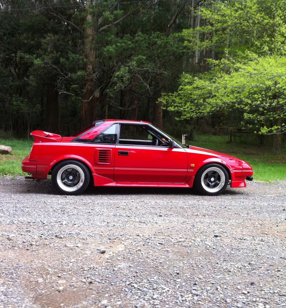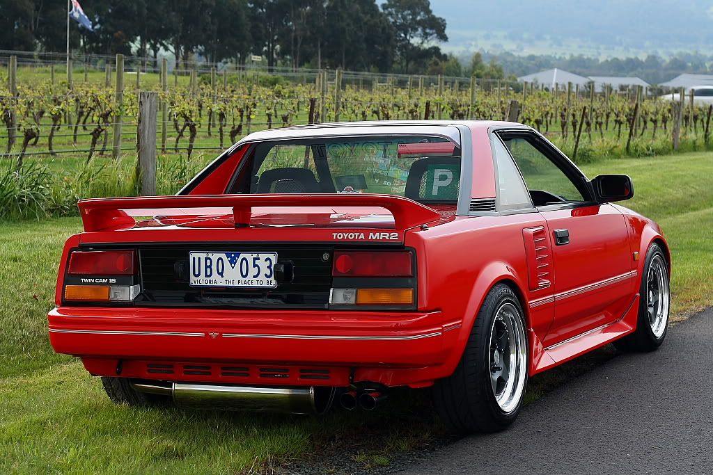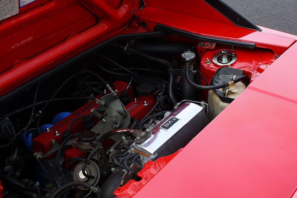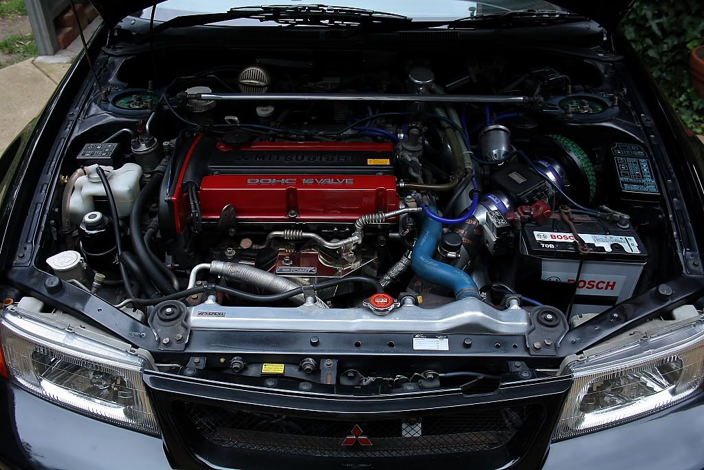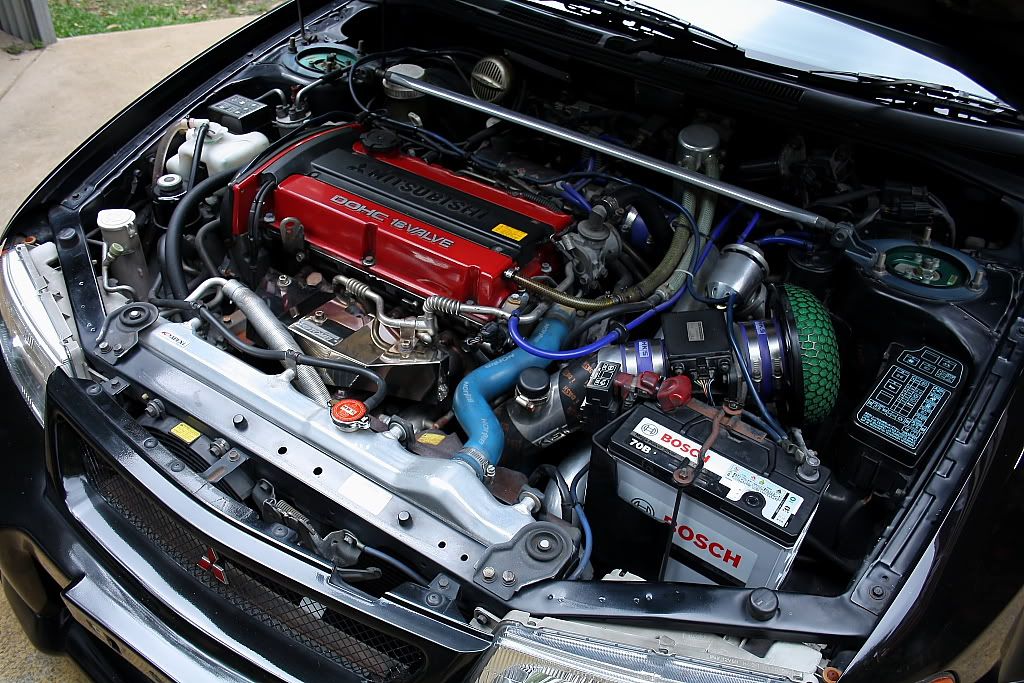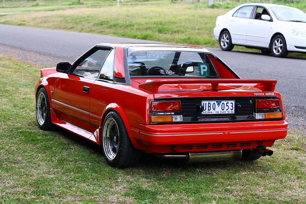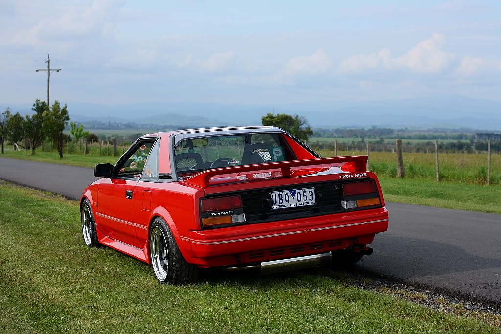 it has an adjustable aluminium wing, aluminium bonnet and (wide!) guards, brake ducts, tacked on rear flares, big front mount air and oil coolers.. with water spray.. etc etc.. so geekily rad. :P