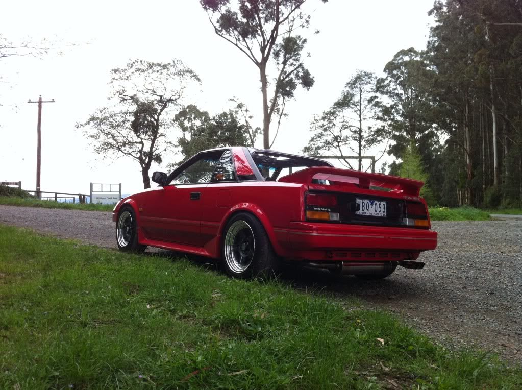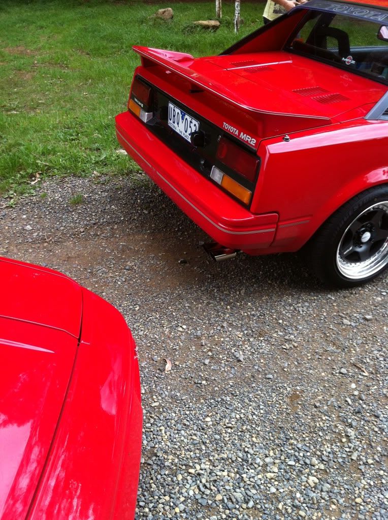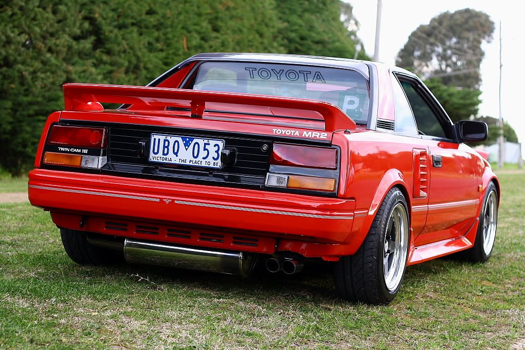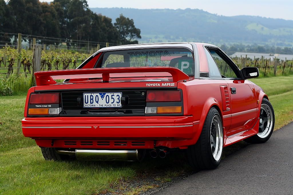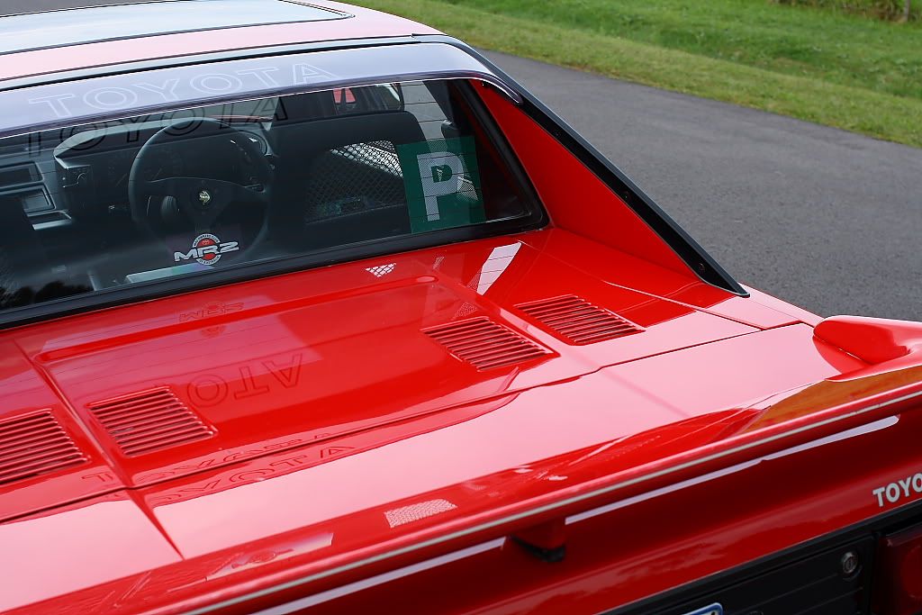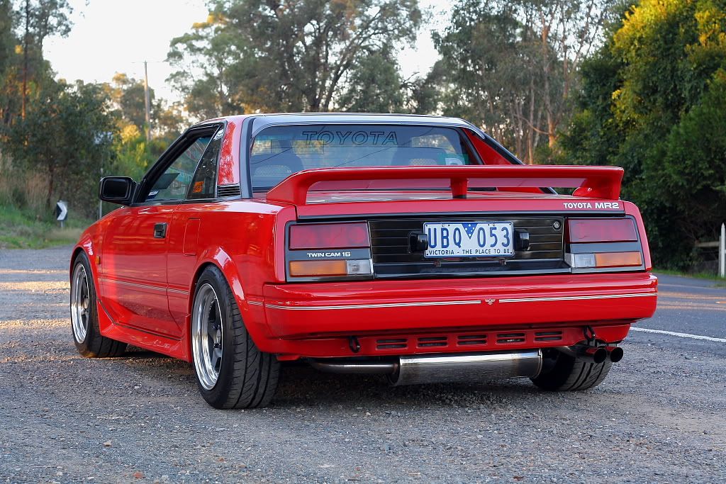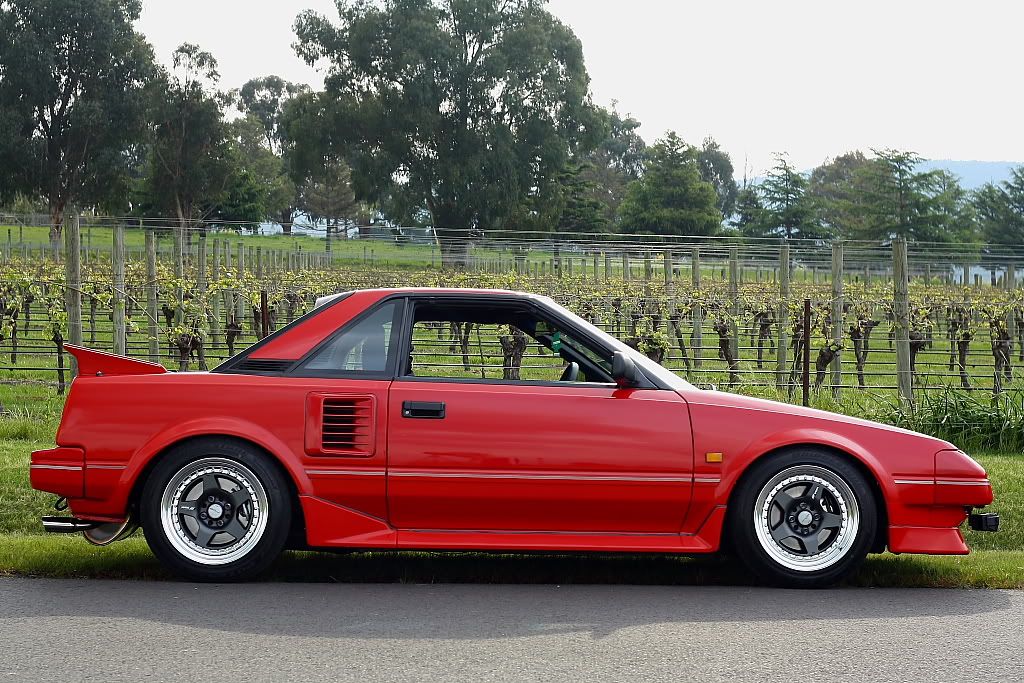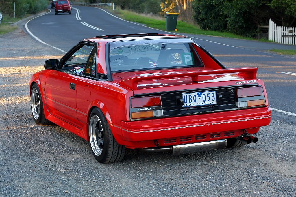 it has an adjustable aluminium wing, aluminium bonnet and (wide!) guards, brake ducts, tacked on rear flares, big front mount air and oil coolers.. with water spray.. etc etc.. so geekily rad. :P