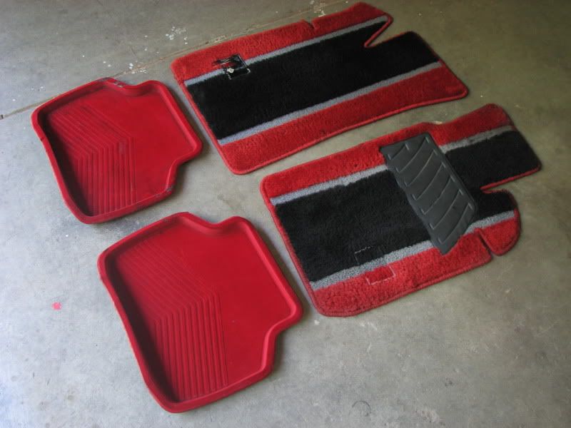 finally got a set of the JDM floormats in Red. little tatty, and someones cut the eagles off; but im stoked! :D no idea why, but very... very... hard to find.  woo. red. gives the interior a bit of colour; the US floormats i had in there before are all black. :) :/ on a brighter and truly random note, the resto on my HJ GTS is just.. about... done. organized a UVP for it the other day. taking it for its maiden voyage tomorrow. havent driven the bloody thing for near 4years. :S    hows the engine-bay for a before and after! :S   banana boat.... da daaaa na nana.. banana boat, its thirty plus... etc..