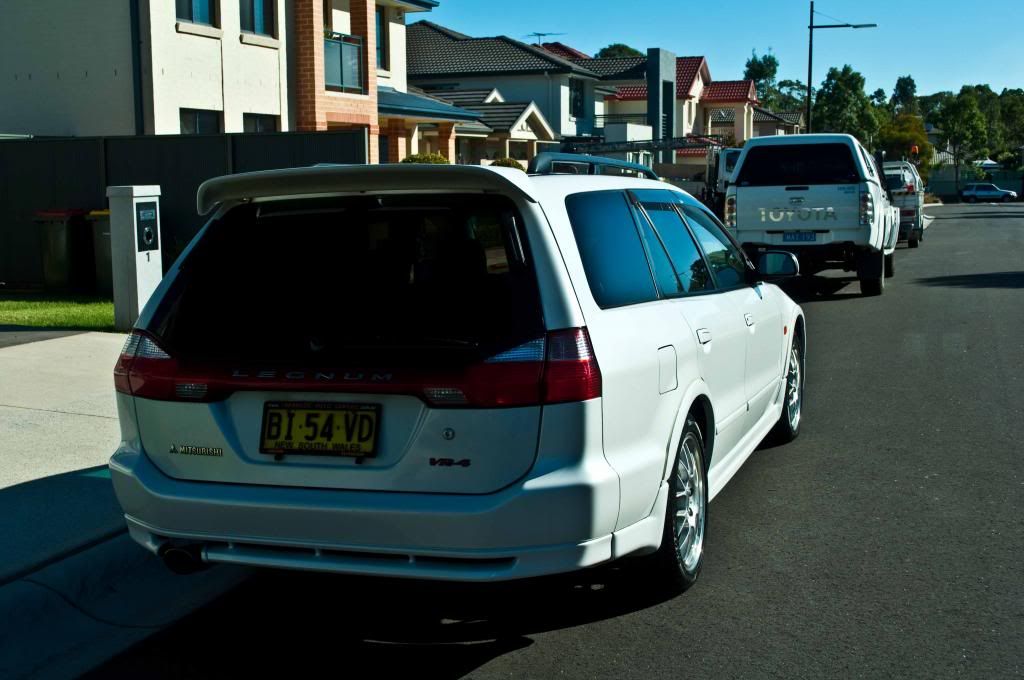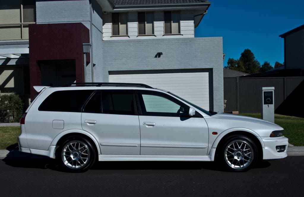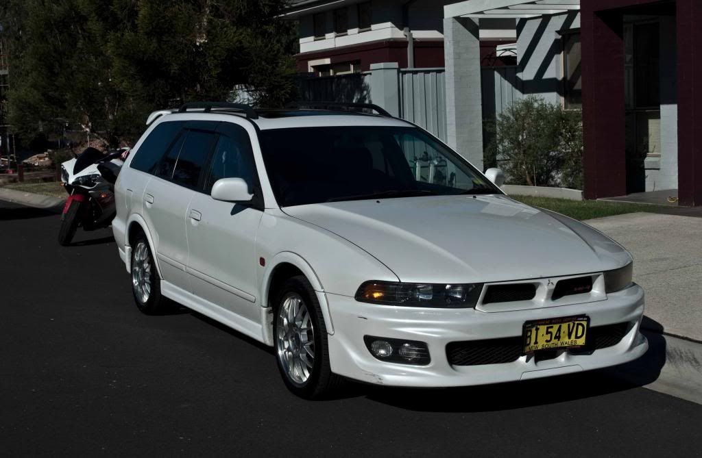 Quick addition to the line-up. Have a baby on the way & needed an additional car with greater family versatility than my IS250, MR2 & FD that the wife can drive. Also have 2 dogs which we like to bring along most weekends for family outings, so a wagon or SUV was a must. Naturally, thought of an ST246 Caldina to keep in line with my Toyota/Lexus loving, but after test driving a few, found them to be more like a hatch & the 4spd auto was a disappointment (too tall gearing). Since I've been admiring Mitsubishi's a lot lately........Enter the Legnum. 4WD turbo, AYC similar to an Evo....Sounded great. 2.5L twin turbo with a 5sp auto.....sounded even better.......Could fit my golf clubs, dogs, baby & be used on fishing/snowing trips........perfect! After 2 disappointing inspections (Thanks Trav!) & toying with the idea of purchasing interstate or importing, I was about to throw in the towel & buy a Honduh CRV. Had a few spare minutes one Friday afternoon & found a newly listed 2000 FL Legnum in Pearl White & Sydney/local. Needless to say, I was on the phone with the seller within seconds & out to inspect it myself the following morning. I'll be honest, it wasn't love at first sight. The car was in quite the sorry state. The owner had been in Europe for the past year & the car had been sitting around unwashed for even longer. Cobwebs, spiders & a layer of dirt is what awaited me. Luckily, there was more than meets the eye & the stars had aligned in my favour. The car was imported in 2010 (sourced not landed/sold) & apparently only had one single owner in Japan before the seller picked it up. The seller had neglected it over the past 2.5 years & it had only had one service (20,000km ago) since it arrived. Slightly overdue for it's major service too. Enough for most to turn away. Spent a decent amount of time going over it with a fine toothed comb & getting underneath it. It had just had a brand new alternator & belt fitted, which was about the only service-related positive. Thankfully, no underbody rust, but only a bit of surface rust at the bottom drain on one of the doors (seems to be a fundamental problem with these) & a bit on the radiator support too. The body was very straight, showing no signs of accident history, the paint beneath the dirt was in great condition to with the only exterior imperfection being a very 15mm long scuff on the front bar & 2 tiny pin dents. The interior was immaculate with the exception of a layer of dust & dirt on the carpets. Massive bonus points for having factory recaros (in mint condition), momo steering wheel & flip out screen. Seems the original owner ticked quite a few of the options when purchasing new. Mechanically, the car sounded great (very quiet motor esp the head), but it was obviously in immediate need of a major service. The transmission shifted okay, except from 2nd-3rd which is a bit rough. Given the service neglect, I'm certain the transmission fluid hasn't been changed in many years. The AYC was clearly functioning, but in need of a service/bleed too I'm sure. All interior electrics worked as intended, including the large moonroof. A/C was working well too. Car idled/drove well. Brakes, however need attention as they vibrate from the front warped rotors.