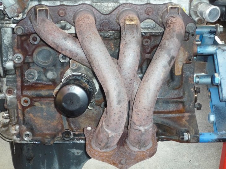 Another weekend's work. Scrap steel to crusher, plastic to tip, big workshop tidy up. Then back to the fun stuff: engine on stand and stripped down. Under all the covers there's an engine :  Nice factory manifold :