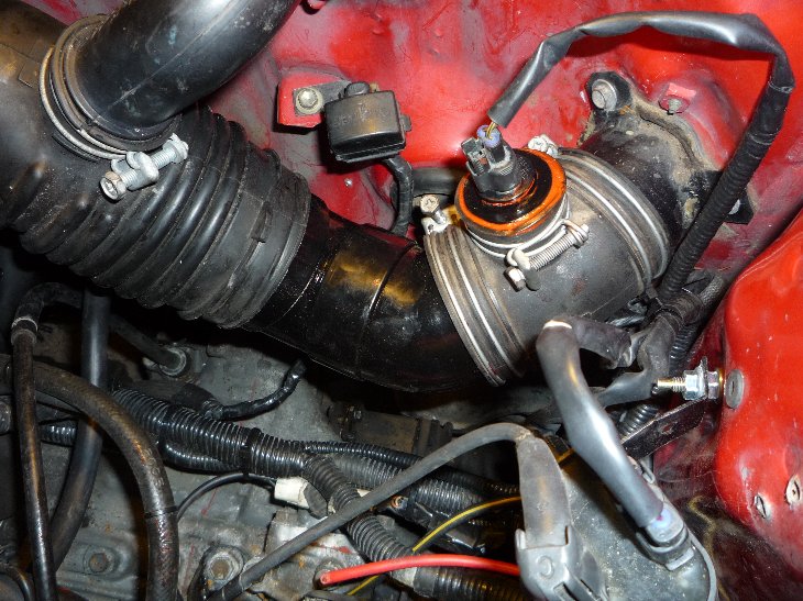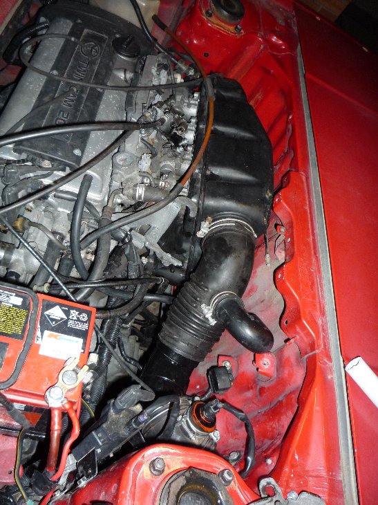 So I rotated the battery 90 degrees, coz I couldn't get the cover off the fuse box as I had mountede it. Now I have heaps of room all round, ant the + terminal is nice and clear of everything. Pics another time. I made this on the weekend :  Out of Bunnings poly pipe fittings. With a bit of ridge removal, it's pretty smooth inside :  And fitted it tonight. It's a perfect size to adapt the ~70mm AW11 intake to the ~80mm blacktop plumbing. I used the stub where the AW11 intake resonator used to go to mount the inlet air temp sensor :  And the final result is this (ignore random hoses laying over engine) :  So that's the intake done. 2 vacuum hoses to fit (cruise and a/c idle-up), and all the air / vacuum will be finished. Engine lid latch next. I would have got more done, but spent all day sunday fitting a 2nd hand 4AT into a friends AE82, after she blew it up on friday. Tonight, her auto died! It was fine test driving yesterday, after the engine swap. I towed her home behind the trusty van, which didn't miss a beat, as usual.
