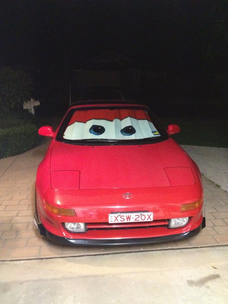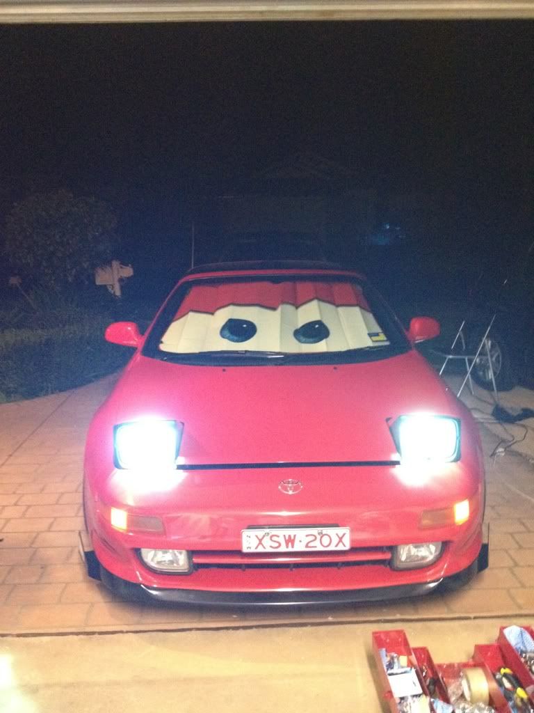Hey Senol, they are off ebay mate. from the US. anyways, got down to business abit tonight. First was the headlights - the left HID light wasnt turning on - after some troubleshooting - I was to take first and easiest action - replace bulb and it worked - i hope it stays working! also notice in the pic - my new sunshield, going for the whole lighting mcqueen look with white lettering and the car being red.   The other day, PhillB came around to roll my guards which fixed a fair bit of the rear rub, but the tyre was still being really dug into by the screw which secures the end of the side strip. After consultation and advise from Jason (MR2QIK), I took the screw off and shaved abit of plastic:  and PhillB's wonderful guard rolling - very smooth, consistent and no cracks!  After this I took it for a drive and tried to put some load on the rear to see if it scrapes - I dont think I heard any at all! which is awesome news. It was also pretty fun not having to hear that horrible scrape noise.