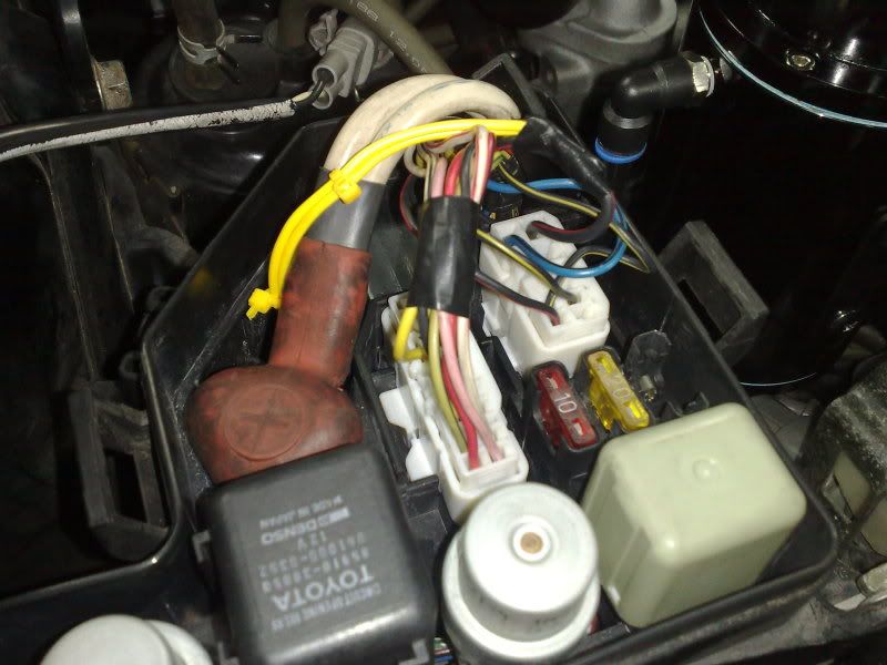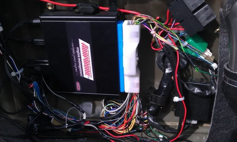 I made some good progress on the remaining wiring in the past week. I was naive to think it was a one-night job, but it's nearly done now. All I have to do is tidy up the temperature sensor wiring, and wire up the Innovate LC-1 wideband oxygen sensor. I was so effing busy at work all week I didn't get to spend any time whatsoever on my mechanic's dyno, which he gave me free-rein over for the whole week while he was away at SEMA in the US. Not happy! Anyway here are a few pics... Adaptronic e1280s ECU wired up, with relays added (top right) for the A2W IC fans and pump: Tapping into one of the existing 12V feeds to supply the new relays:
