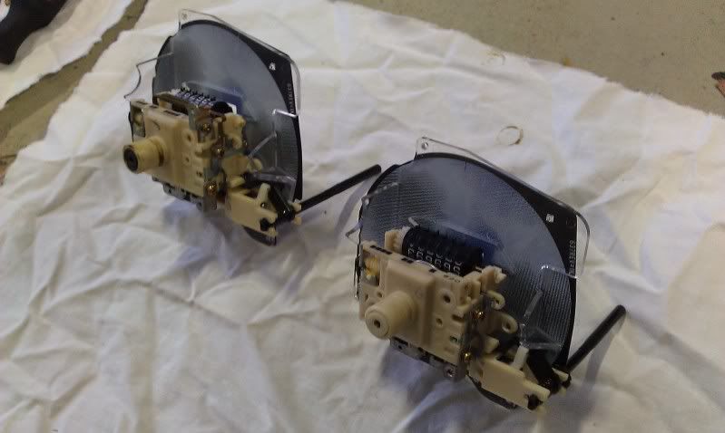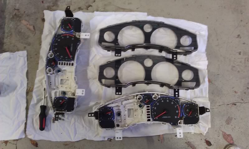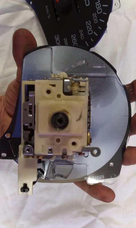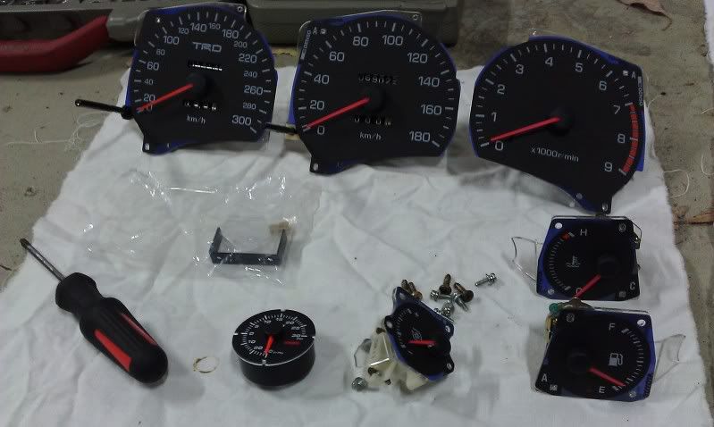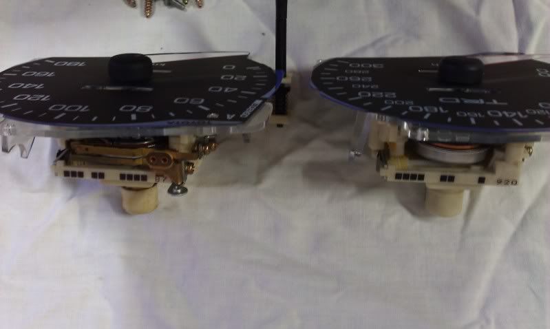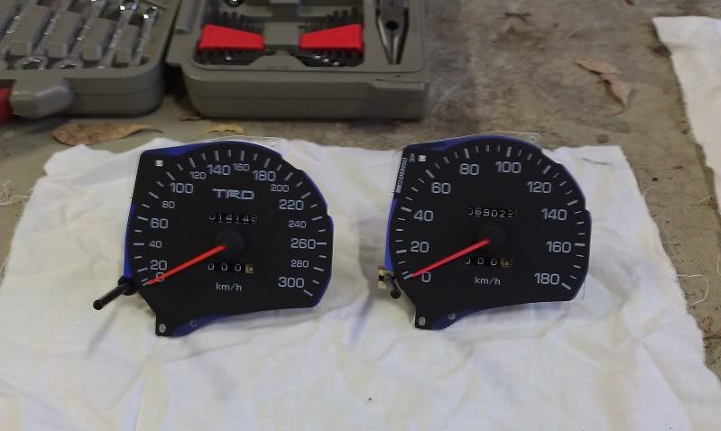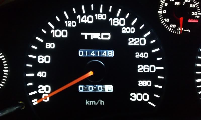 I started working on this tonight. Dash disassembled:  Instrument clusters (I'm taking the TRD speedo out of the one I just got and putting it into mine, for peace of mind):  Back of my cluster:  Front of cluster after taking all the gauges out:  All the gauges separate:  300km/h TRD speedo and stock 180km/h speedo, both mechanical:   Top of both speedos (there's a brass thing on top of the stock one, but not on the TRD one, which looks like a trigger for an over-speed buzzer on the stock one):  Back of speedo, notice the purple mentioned previously (I need to clarify with Bionikal which region he was referring to specifically):  Once the white LEDs arrive I'll install those in the cluster, and I still need to wire up and attach the Omori boost gauge to the cluster. Bionikal...to sand back the purple as you mentioned, do I need to carefully pull the needles off the gauges so I can remove the transparencies? Do I need to sand it from the back (the side shown in the last pic), and only in areas where light is supposed to shine through I guess? Also a general question for anyone who might know, can I take the odometer out of my stock speedo and put it into the new one, or is it too fiddly?