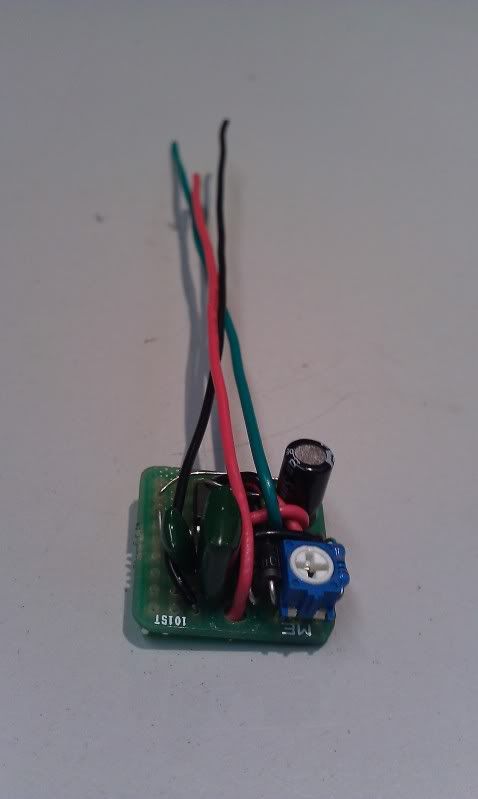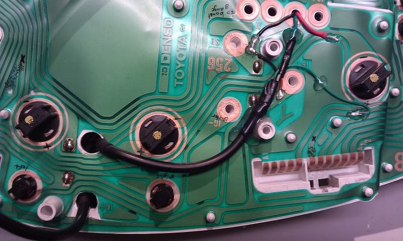 Tonight I was very busy finishing off my instrument cluster. This shows 2 of the 4 white LEDs in place of the stock bulbs:  This is the gauge faces after sanding the purple off the back (ignore the black pen marks, I drew them on there so I could identify things more easily):  This is after dealing with the hotspots (where the brightness is more concentrated), I originally used reflex paper but it was too thick so I started again with the thinner paper shown here:  This is my copy of cogs' PWM dimmer circuit for the Omori boost gauge illumination:  Wiring of Omori boost gauge to cluster (the 4 adjacent holes at the top are where the stock boost gauge signal conditioning circuit normally attaches, but this was removed, so I put my dimmer circuit in the same spot and fed the wires through one of the 4 holes):  End result!...      When mounting the Omori boost gauge to the cluster, I took the easy way out...I used hot glue, because the Omori gauge fits really nicely into the space anyway so I just needed to stop it moving (I forgot to get a photo). It also meant that I could apply the glue then quickly fit the front of the cluster so the glue would set with the gauge in the perfect location. I'm very happy with how it all turned out. Thanks to cogs and Bionikal for their help!