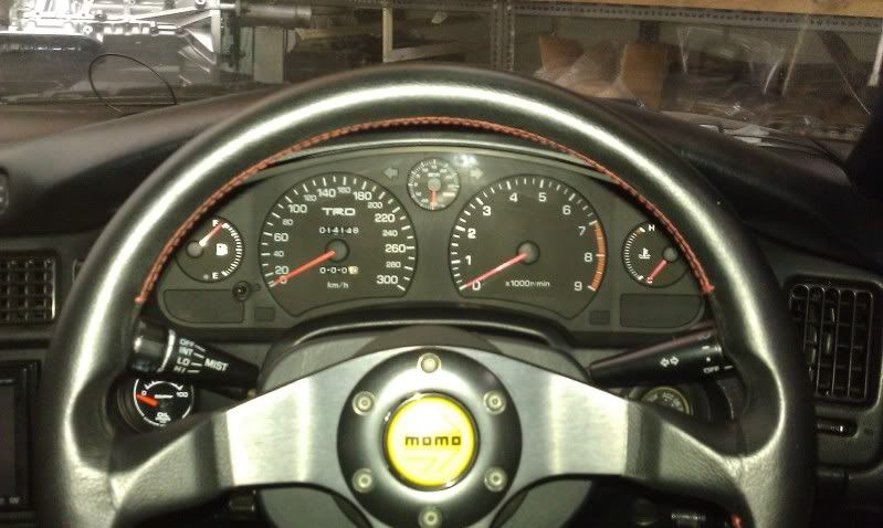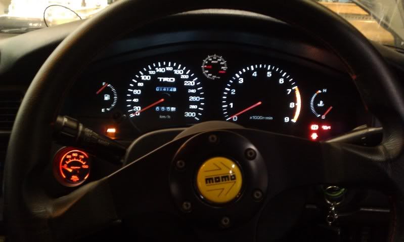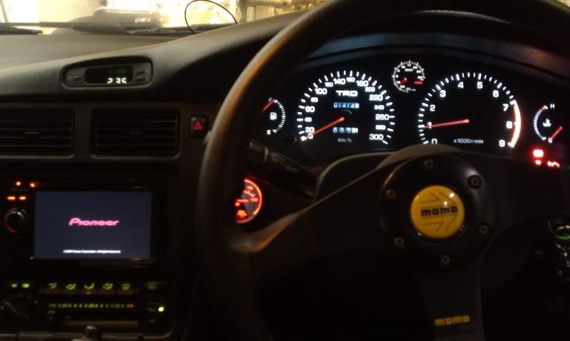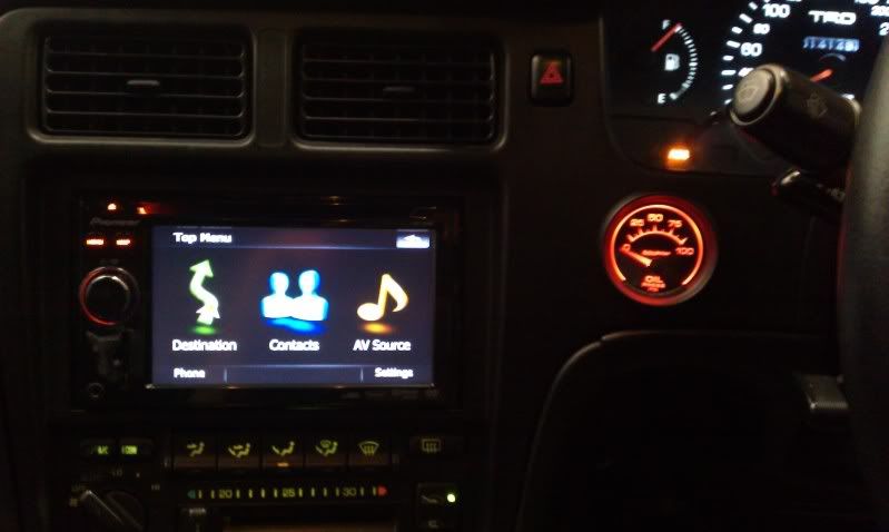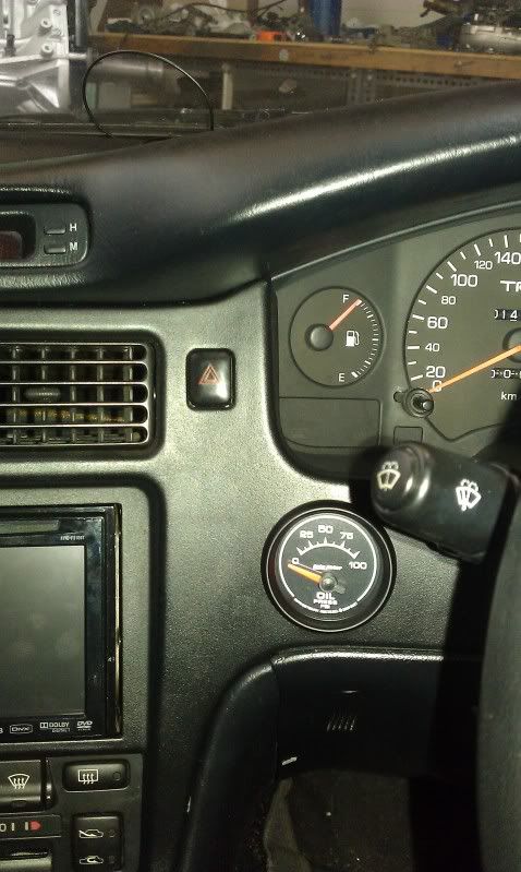 I finished fitting my oil pressure gauge today (well, the cabin side of things, not the sender). This also means that I've taken photos of the cluster fully installed back in the car too.  I didn't realise the oil pressure gauge would have red illumination instead of white, but it's alright because I've now set my head unit to red illumination too.  As you can see below, the oil pressure gauge happens to be in my line of sight in the gap between the arms of the steering wheel and the left control stalk:  And here are some photos showing the overall completed dash setup:    Enjoy!