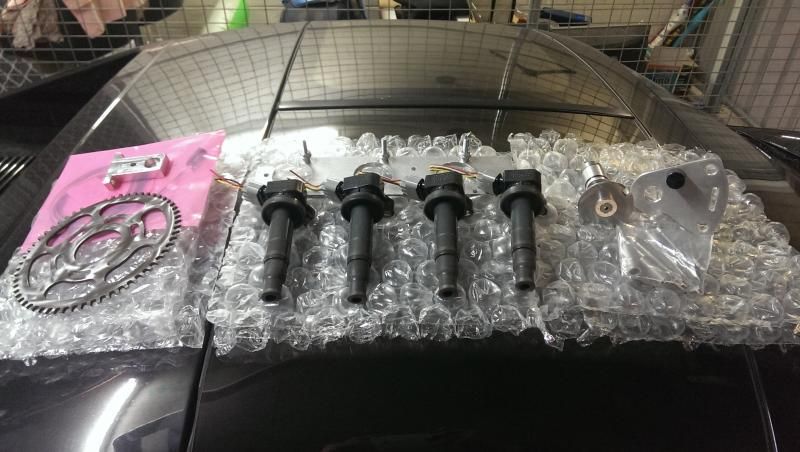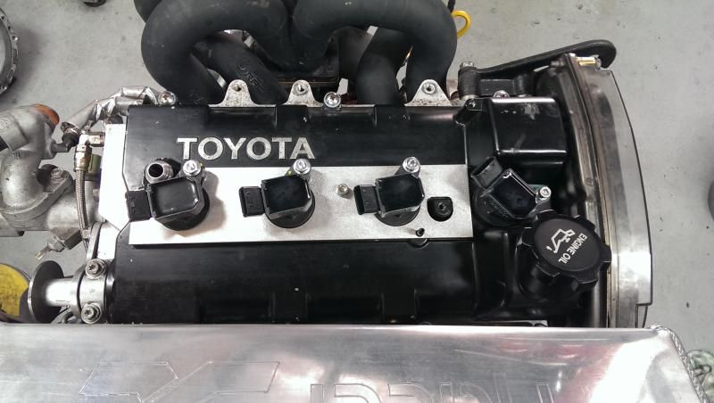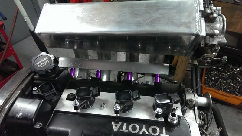 I must have arrived at MRC just after you left today! Changing ignition systems doesn't magically increase power, but once you reach a certain power level (not far above where I'm at now) the stock ignition system won't hold up. The 1ZZ coils have been used on 3SGTEs with something like 700hp at 30psi of boost, so they are very capable coils! They have built-in igniters too. I'm also happy to have hall-effect sensors instead of the annoying reluctor sensors in the dizzy. Reluctor sensors are annoying because they produce a signal that varies with RPM, ie. the voltage amplitude increases as RPM increases, and you don't see a useful signal at all unless the RPM is close to cranking speed or higher. With hall effect sensors, the signal is simply 'high' or 'low' depending on whether there is a tooth in front of the sensor or not. For a stock ECU this doesn't matter and the reluctor sensors are totally fine, but for aftermarket ECUs it's nice to have hall-effect instead to make things simpler. My new trigger wheel on the crank has the added benefit of providing much more timing resolution compared to the stock trigger setup inside the dizzy. Here are some photos that I took today: 1ZZ coil-on-plug conversion with adapter plate (part of RacerX kit): RacerX fuel rail kit with ID 2000 injectors: Other photos showing the RacerX plenum etc: