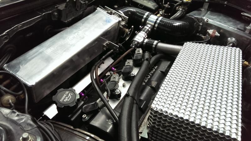 Hey Rob, I think you will be pretty happy with the seat of the pants 'feel' of the new turbo. Its very similar to mine. Did the guys who fitted the 'turbo box' mention anything about increased radiant heat from not releasing the hot air? The heat damage you are experiencing in the engine bay is what I saw in the Wakefield 300 and have been trying to sort it out too. I had a problem with the wiring for the coils had melted and the coils had failed due to the heat. I rewired the coil wiring, replaced all the coils then triple shrink wrapped the wiring for protection. Everything has been ceramic coated and wrapped in titanium heat wrap. This did make a big difference to engine bay heat. The next step was to create a shield between the headers and the head with the radiant heat expelling out through the engine cover. The same product you have used does the trick. All the coolant and oil plumbing received the 'red high temp sleeving and there is a reasonable amount of gold leaf to top it off. After this, a undertray with ducting was added to improve the air flow from under the car. This created a huge amount of air flow into the engine bay. s a test we ran a fan at the front of the car which was then blowing a noticeable breeze out of the engine bay. This may be worth looking into for your application. I have to say the 'turbo box' is a concern to me as there is not where for the air to flow out of the turbo operating region. This will only stall the air around the block/head/oil filter/fuel lines which will create more issues including too much heat directed at the cylinder head. The water to air looks great. Its something which I will do to mine in the future. Looking forward to seeing the results of the new IC.