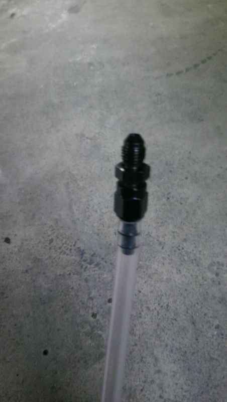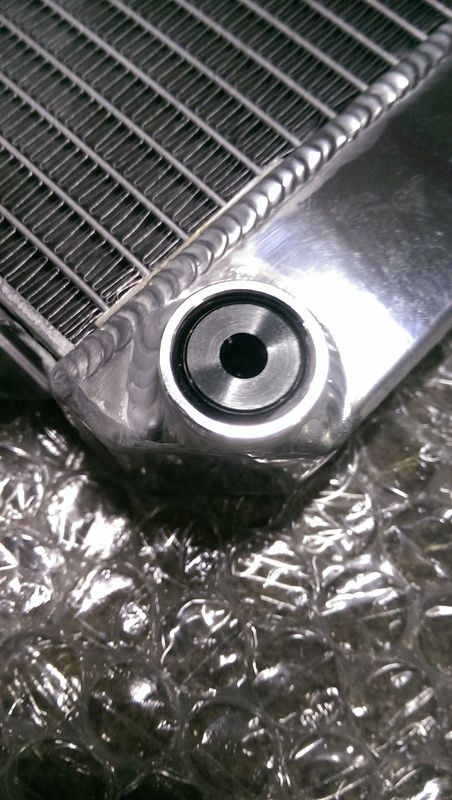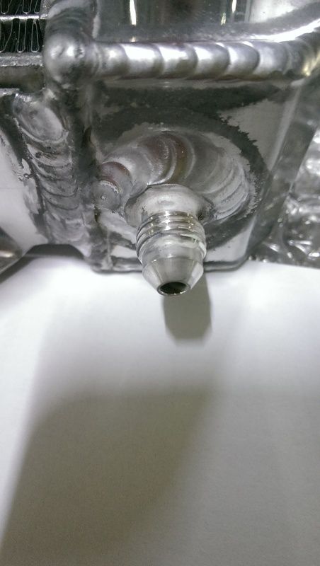 Stock fans mounted to the radiator (I had to get replacements because when I hit the wombat the fan shrouds got badly bent and caused the fans to seize and their motors to subsequently burn out): Bottom edge, showing the lower mounting points for one of the fans, and one of the things that sits in the rubber mounts in the lower radiator support: Lower drain port, which comes with a simple plug that you can remove with an allen key: Port where the stock 'sensor' screws straight in: One of the coolant hose connection points: One of the things that pushes up against the cushioned stock top brackets: For the top air bleeding point, the PWR radiator just comes with this dash 4 fitting welded on, so it's up to you to come up with something suitable to attach to it: This is how I handled the top air bleeding point (I bought all of the following things from Motorsport Connections):- 90 degree dash 4 hose end (to clear the chassis)- Into a dash 4 rubber hose, 70cm long- Into a dash 4 straight hose end- Plugged with a dash 4 plug (see below) Then, when I want to open it up to bleed out the air, I temporarily remove the dash 4 plug and replace it with this (it's a combination of a dash 4 male-to-male and a dash 4 straight hose end, with a clear tube pushed onto it): The 70cm rubber hose is just the right length to fit along the width of the opening above the radiator. I wanted it to be fairly long because when I'm finished bleeding the air out of the system, I then lift up the rubber hose above the level of the coolant, remove the thing in the last photo above, then slowly lower the hose until the exact height where the coolant is about to spill out, then reinstall the dash 4 plug. It's quite easy, and it eliminates the leaking O-ring problem associated with the top air bleeding tap on the stock radiator.