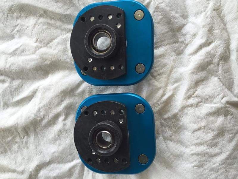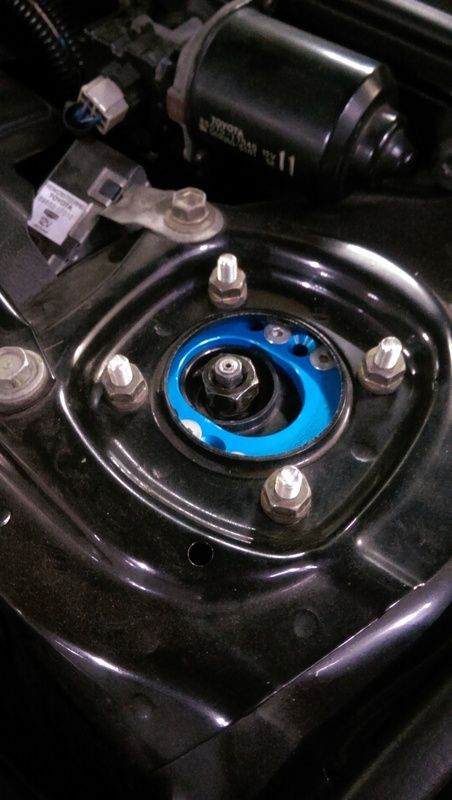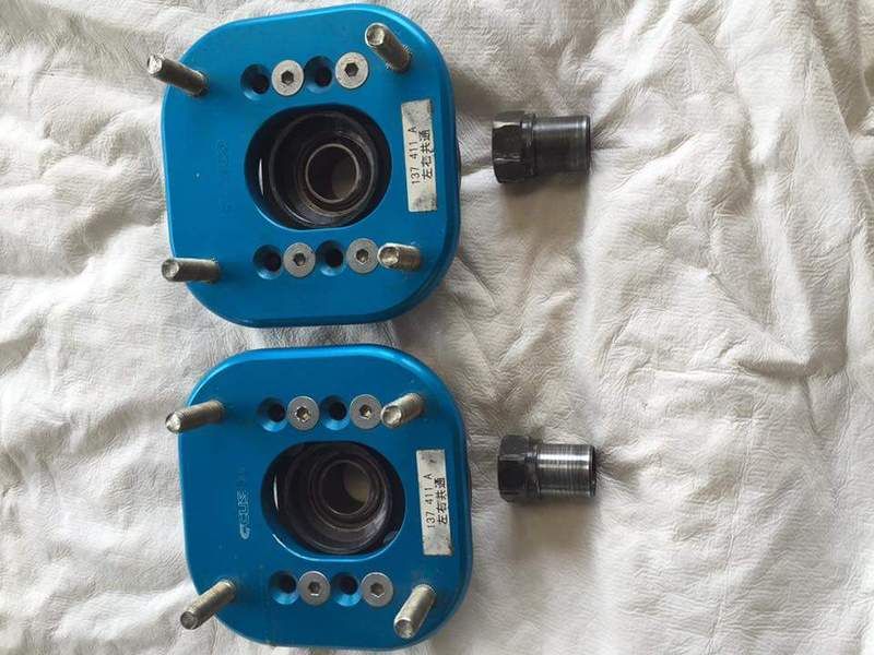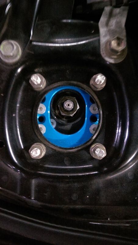 I just finished installing some Cusco front camber top mounts. Adjustable camber top mounts are normally used to achieve more negative camber than stock, especially for cars which see plenty of track time. In my case, that was one of the reasons but not the main reason. I mainly wanted to increase the tiny clearance between the spring perch on my coilovers and the inside of the rims/tyres. Camber tops alone don't help this, but they do when combined with either crash bolts OR an elongated hole where the coilover bolts to the knuckle. My KW V3 coilovers came with an elongated hole as shown below. I maximised the clearance using the elongated hole, then brought the overall camber back to a good spot using the adjustable camber tops. The two things on the side of the photo slide into the top of the spherical bearings in the camber tops, and screw down onto the threaded part on top of the coilover rod: Underside: Top view after installation, showing the maximum negative camber that can be achieved with these camber tops (I think it was approximately 12mm closer to the middle of the car compared to the stock top mounts):