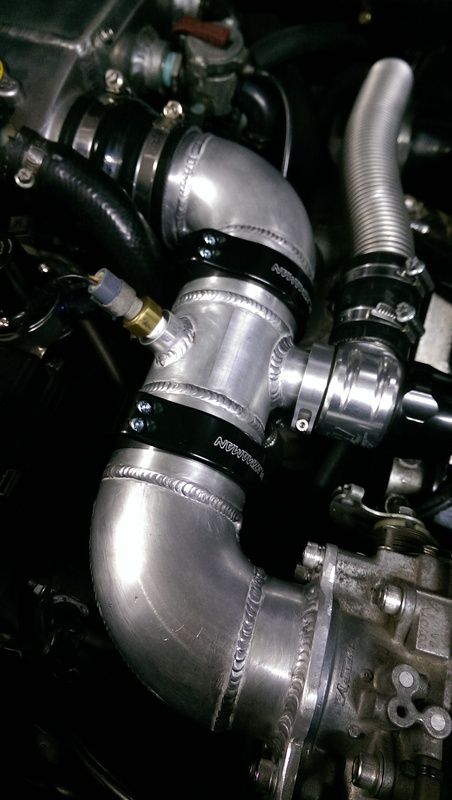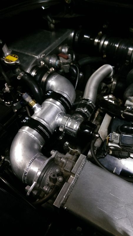 My upgraded intercooler piping is now complete. The turbo-to-intercooler piping did cause me a lot of trouble in the past, but I fixed that a while ago. More recently, the intercooler-to-throttle piping started causing trouble too. I just finished fixing that too, as shown in the photos below. In the past, intercooler piping problems have ruined track days and drag nights for me, so this time I was willing to do whatever it takes to fix it. As such, I decided to incorporate not one but two (very expensive) Plazmaclamps into the new piping. The Plazmaclamps do allow a surprising amount of movement, but I concluded that I would need at least two of them to allow enough movement overall based on my estimates. I should point out that when fabricating intercooler piping with Plazmaclamps, it requires a lot more time, precision and money compared to using silicon joiners. Therefore I don't recommend taking the same approach as me unless you have to. I could've made it work with different silicon joiners and that would've saved me a lot of money, but I just wanted to fix the problem once and for all. Plus I think it looks awesome now with the Plazaclamps and beautiful aluminium welds. I was also able to increase the clearance between some of the nearby parts, which is a nice bonus.