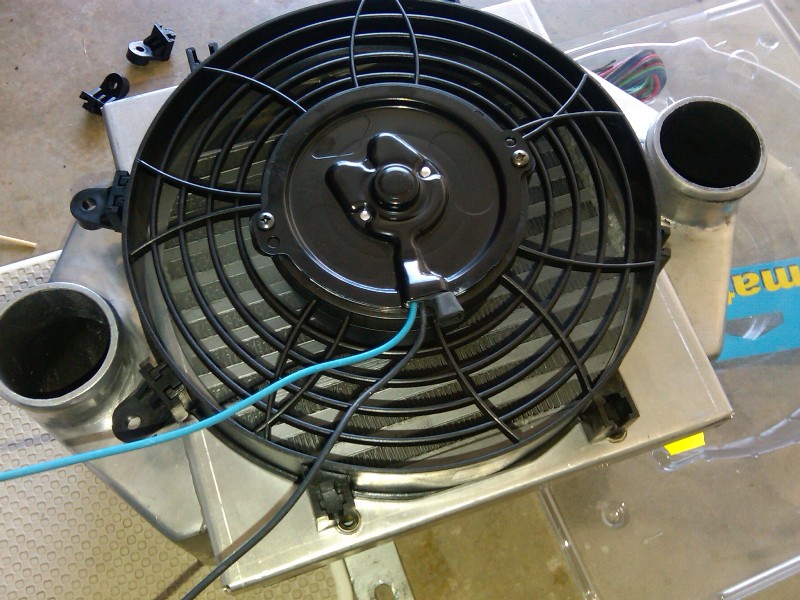 I run a Davies Craig 9" (I think) thermo. It can be set up to either push or pull, but in this application you'd want it to pull. You can use the stock fan, but its not as efficient as new aftermarket ones these days. SPAL also make good thermo fans to suit. Ideally you'd want it setup to turn on with a boost trigger. Heres mine