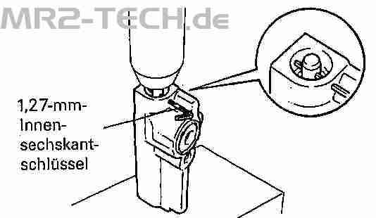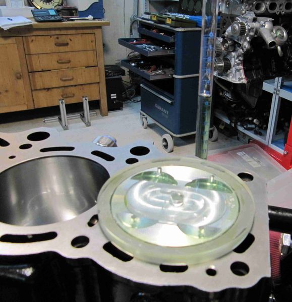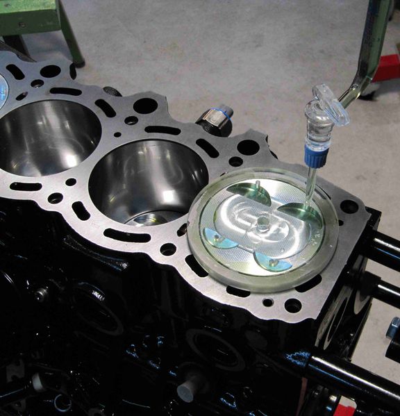- Mit Hilfe einer Kolbenringmanschette den mit der entsprechenden Nummer versehenen Kolben samt Pleul von oben in den betreffenden Zylinder hineindrücken. Dabei muss die Frontmarkierung auf dem Kolbenboden nach vorne weisen.