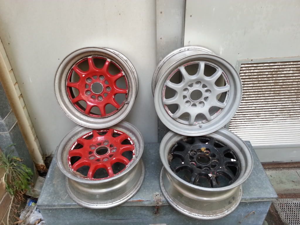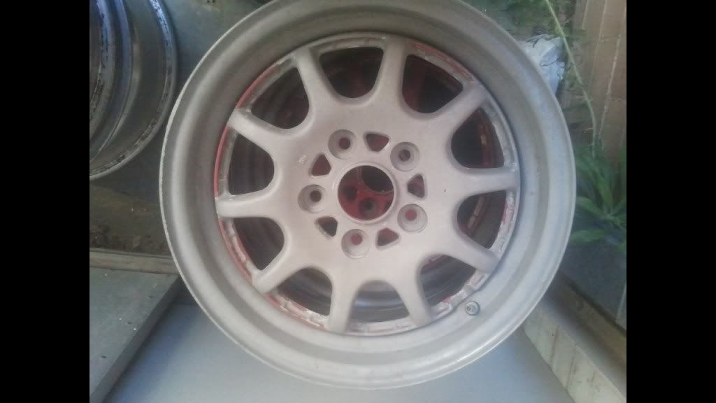 racing harts are 15x7-1/2 +30 and i think 15x8 +40. need a good clean up paint etc. $80 the set. i'll load pics later tonight. ones atrted to be sand blasted, 2 have red paint and one with black paint. gtst are from an r32. ones nice poweder coated goldy colour and the others black FREE!