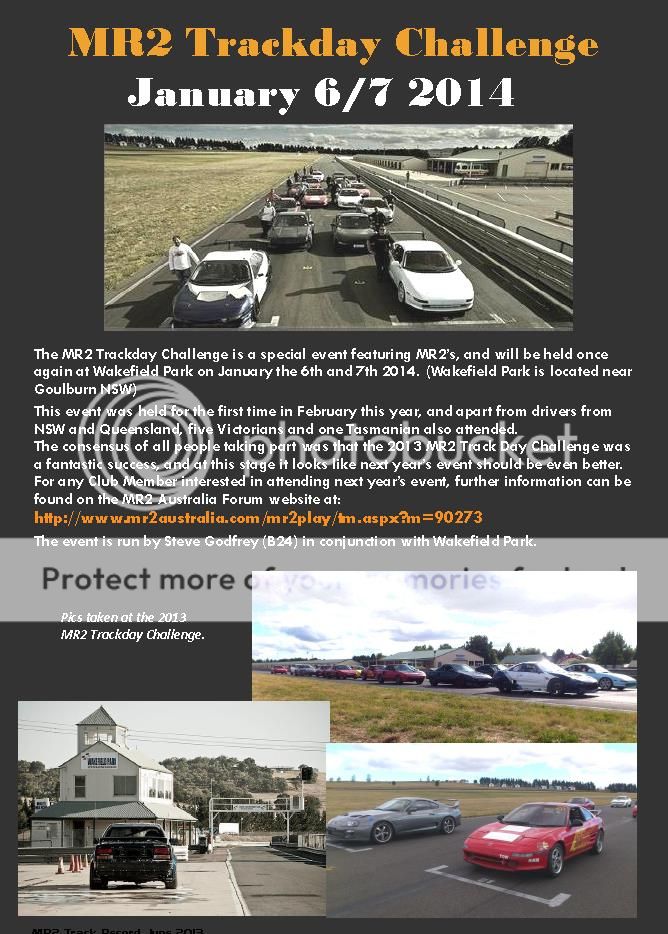 I have completed the information pack, the options for entry and the new account will be finished next week. Payment options will include Paypal, Credit Card, direct deposit and cash(if you are in Sydney). I hope people are not confused with the three classes or feel they will not fit into any class but it is structured so you will. The street class has opened up to allow minor mods with modified street taking on the more heavily modded cars. The circuit class is the same a last year. Another change I am considering for 2014 will be grouping experienced drivers together and newbies in their own group. There are 4 cruise sessions allowing for people to experience the track at a refined pace. There are also enough passenger sessions for all to enjoy a lap around the track at speed. Its up to the people looking for a passenger run in another car to organise this. I have allowed for a show and shine and undercover parking for those interested in this package but I will not be organising a Show and Shine or a 'run' to the track. This will need to be taken on board by a few individuals or managed by one or more of the MR2 Clubs. There is a early bird payment option which expires on the 1st of November 2013. Here is the link to the info pack http://www.ultimatetrackdaychallenge.com.au/wp-content/uploads/2013/07/MR2-Ultimate-Trackday-Challenge-2014-regs-event-details.pdf Cheers Steve